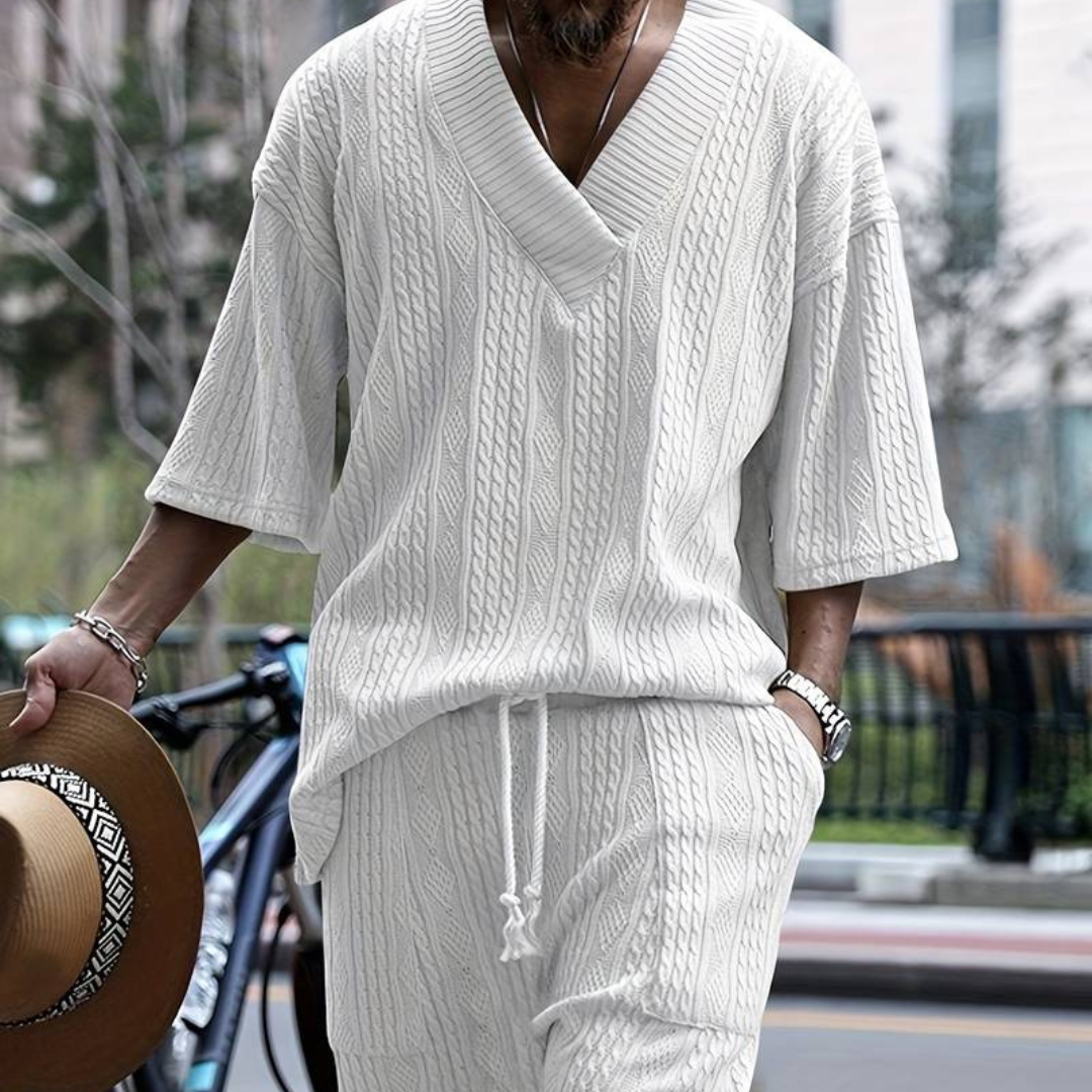 The Albany Cotton Weekend Set is your ultimate summer upgrade—combining modern elegance, breathable comfort, and a sleek V-neck design in a premium matching top and shorts set made for the stylish man.