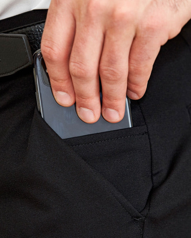 Our tapered athletic fit provides more room in the seat, thighs, and quads while still having a nice taper below the knee. Excess fabric in the hidden hemline allows for adjustable inseam lengths when taken to a tailor.