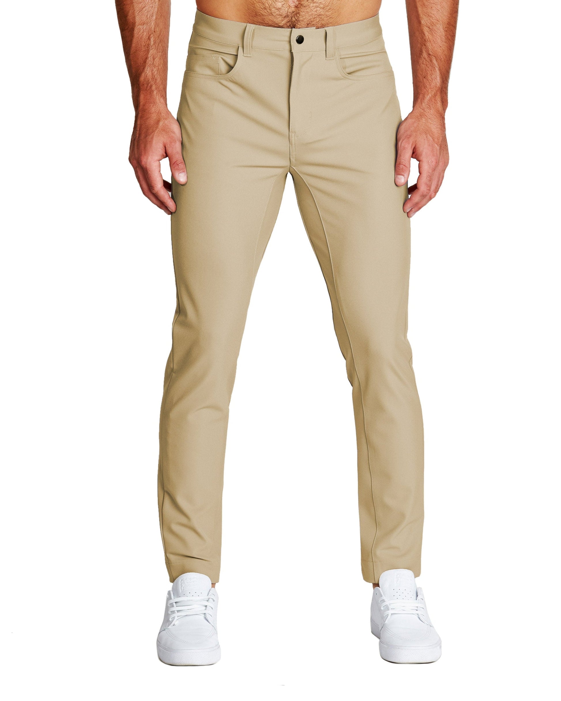 Built on the forefront of fit and comfort - these are the perfect tech chinos for guys with athletic legs. The fit is built for guys who need more room in the seat, thighs, and quads while still looking to achieve a casual, tapered look. The insane amount of stretch in these pants allows them to be worn tailored without sacrificing comfort.