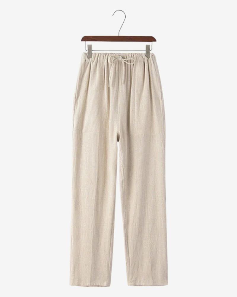 Beige Straight-Leg Trousers: With an elasticated waistband and adjustable drawstring, these trousers provide a tailored look without sacrificing comfort. The light, natural tone contrasts beautifully with the black shirt, offering a sophisticated yet effortless outfit.