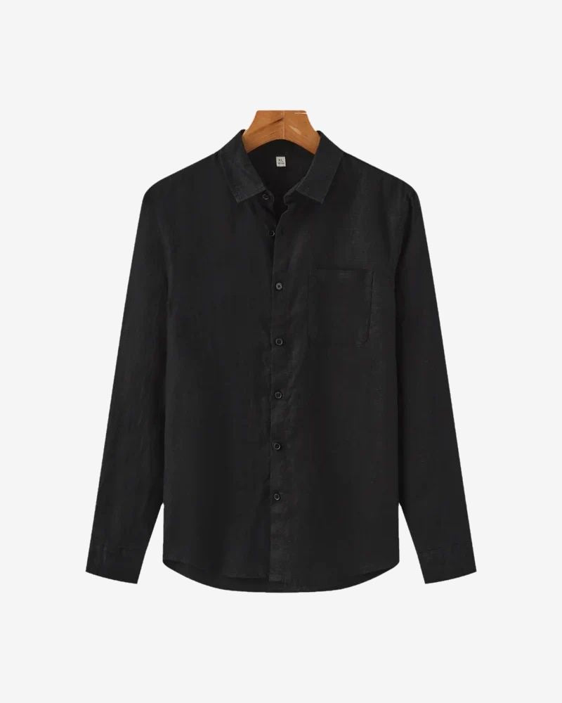 Black Long Sleeve Shirt: Designed with a classic collar, single chest pocket and button-down front, this shirt is made from a lightweight linen-blend fabric that feels soft on the skin. The long sleeves make it perfect for evening wear or transitional weather, while the breathable texture keeps it relaxed and cool.