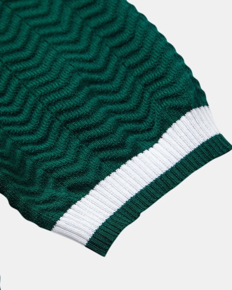 - Textured Knit Polo with Contrast Collar: Designed with a subtle zigzag weave, this polo features a striking contrast collar and trim, adding visual interest to a clean, structured silhouette. The ribbed hem and cuffs ensure a tailored look, while the open collar brings relaxed sophistication.